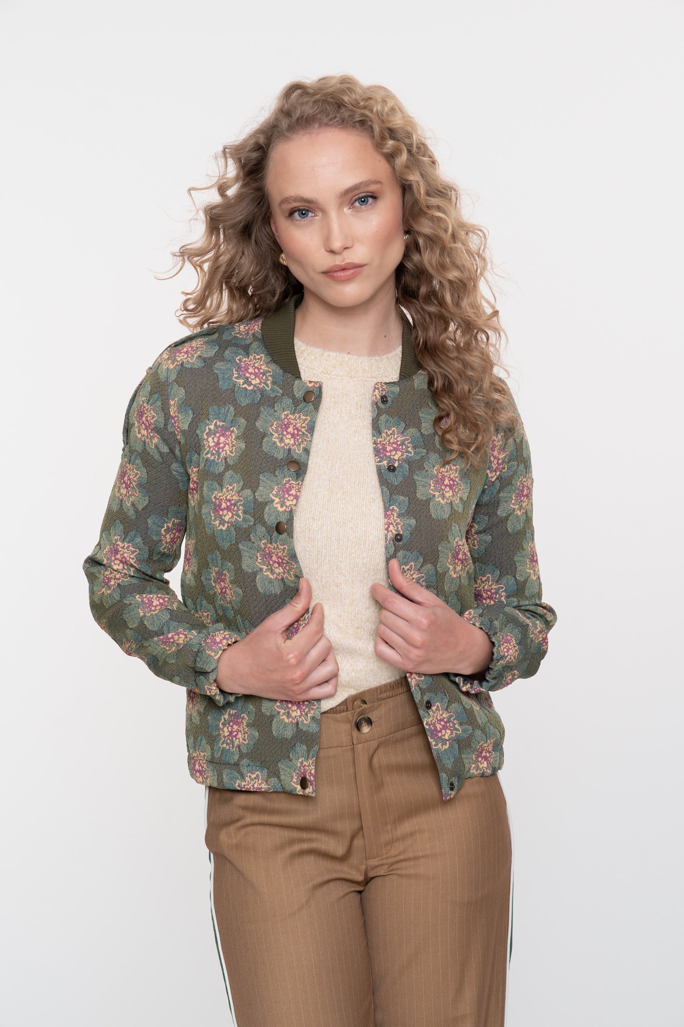 Geisha dames groen bomberjasje met bloemendessin en drukknoopsluiting