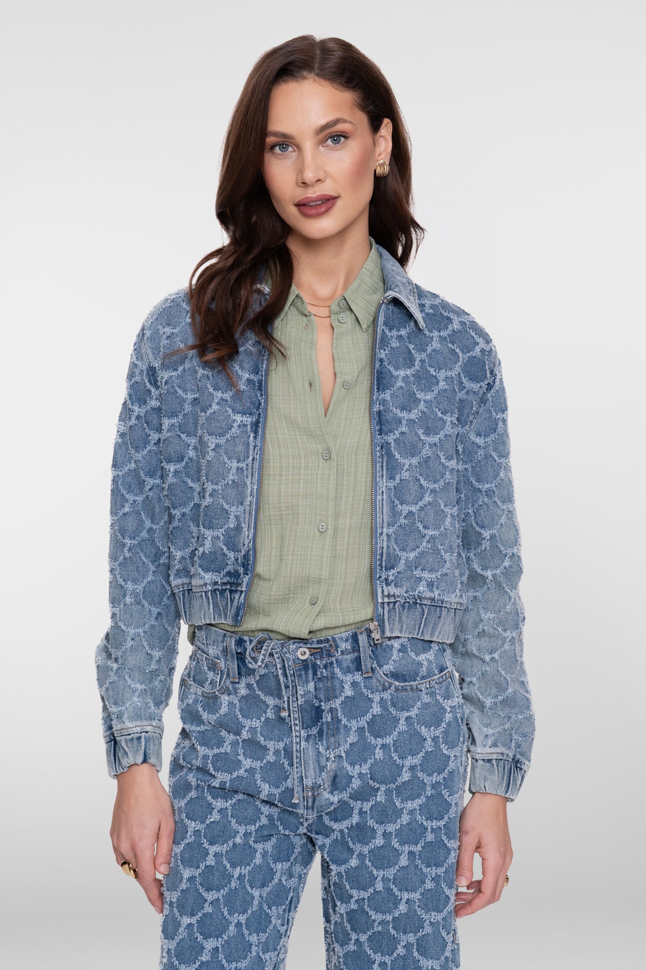 Dit jasje uit onze S26-1 collectie is een eigentijds denim jack met een verfijnde cirkel jaqcuardprint en een moderne, licht boxy pasvorm. De ritssluiting en elastische boorden zorgen voor een comfortabele fit. Draag dit item als set met de bijpassende jeans of short voor een stijlvolle zomerlook met karakter.